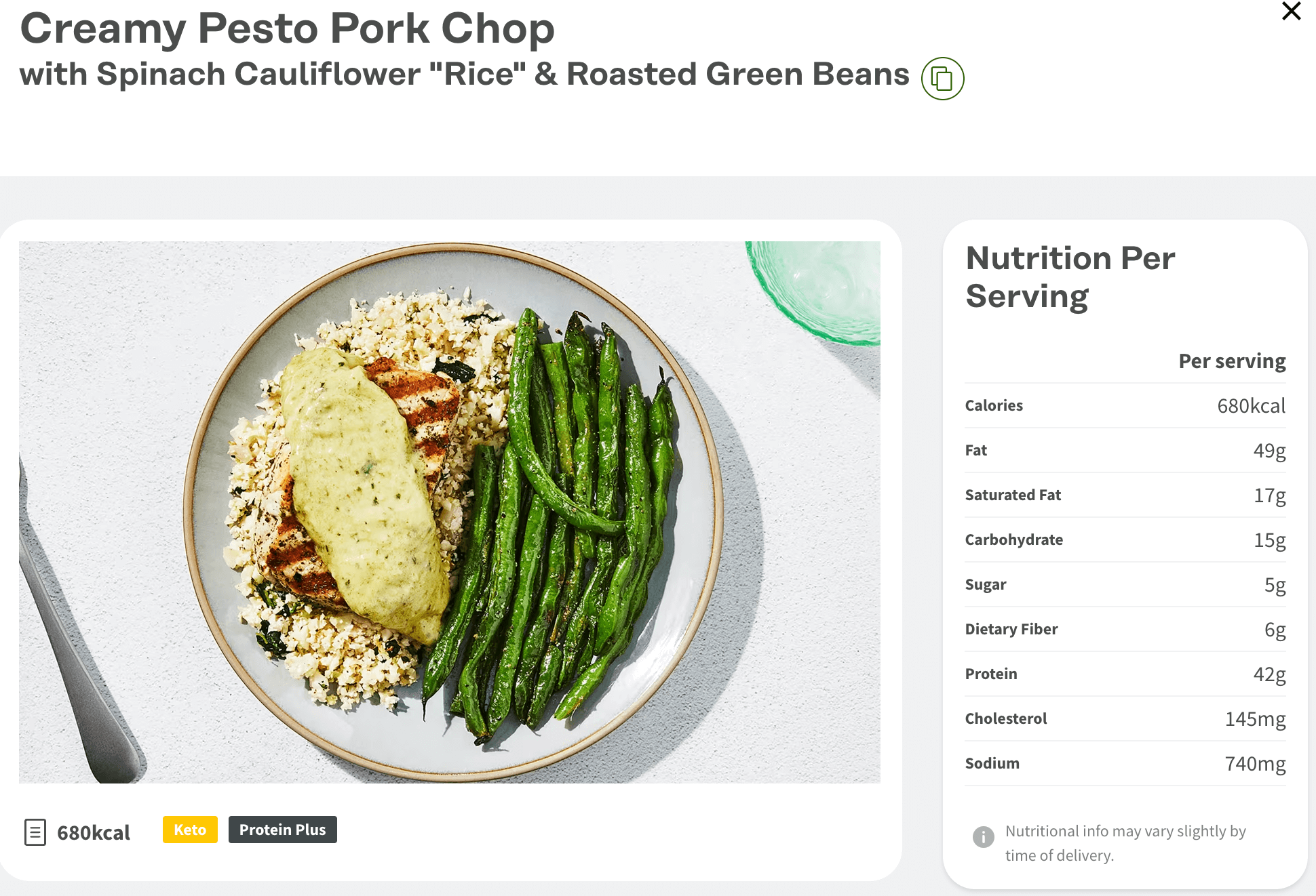Creamy Pesto Pork Chop from Factor with nutrition information